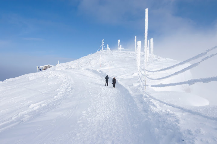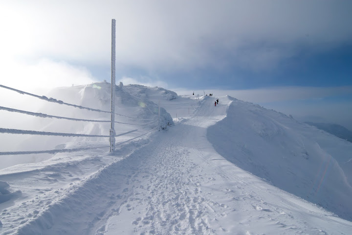 Even so, it was a novel experience and we spent quite a bit of time laughing at the icicles that formed on our hair, frost on our glasses and crusted runny noses. Everyone from the cable car has already overtaken us and reached the first peak, demarcated by a huge ice frosted cross. We did not make it there, mainly because of me. Yet, in the short stretch, we managed to take lots of photos of wind swept ice, perpendicular to the ground, growing from poles and rocks. I began to pity the guys who had to stay at the Arctic an entire year filming the penguins movie.